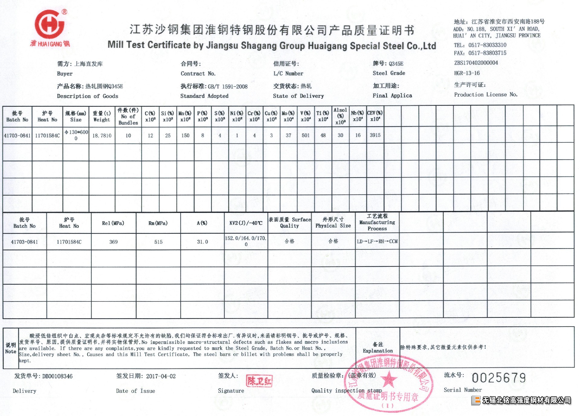 每支材料均有對應爐批號鋼廠質量證明書(質保書),保證-20℃、-40℃ 低溫沖擊功值合格。