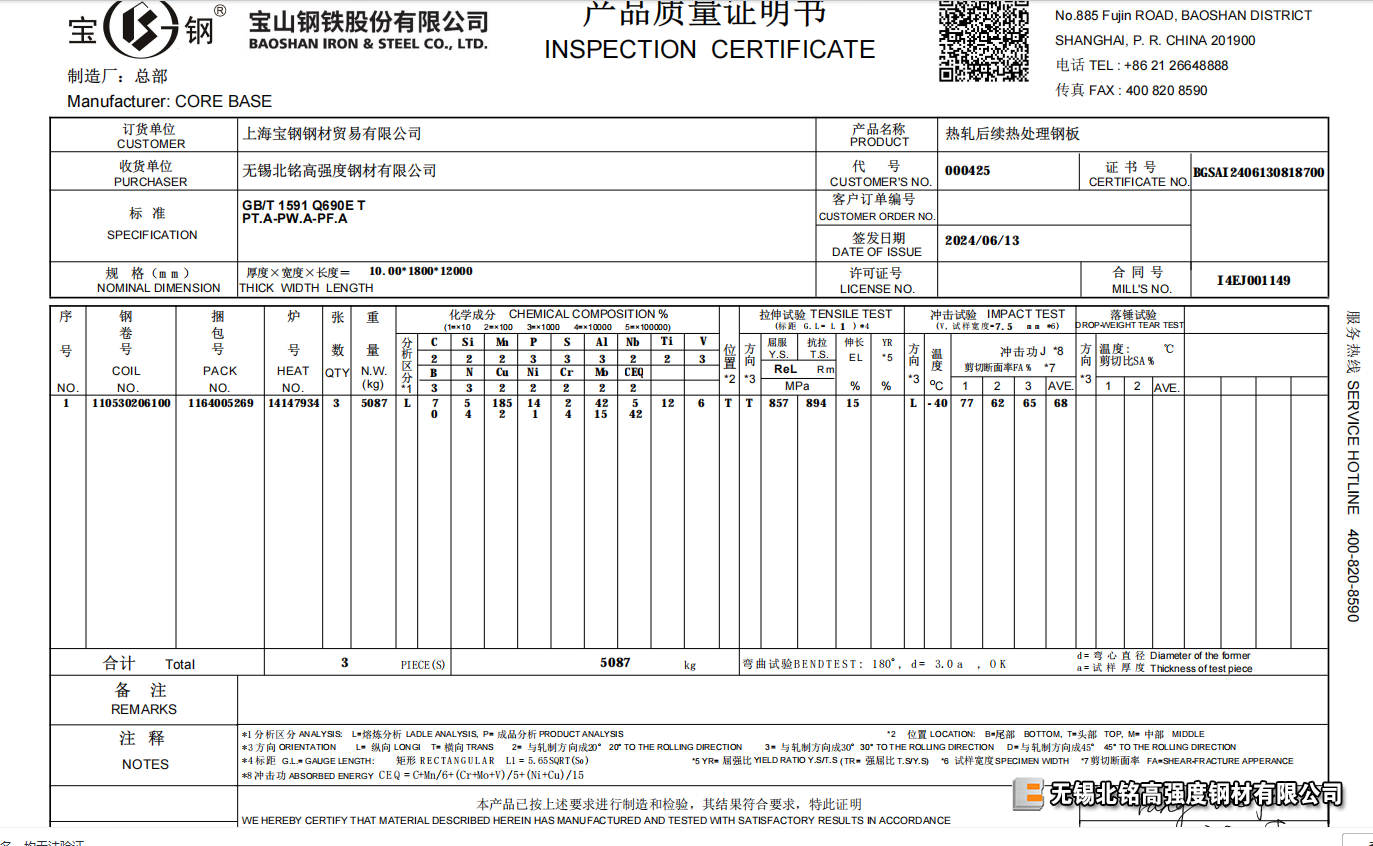Q690E為國標高強度熱處理板,屈服690帕以上,抗拉780以上,E代表-40℃耐低溫性能。