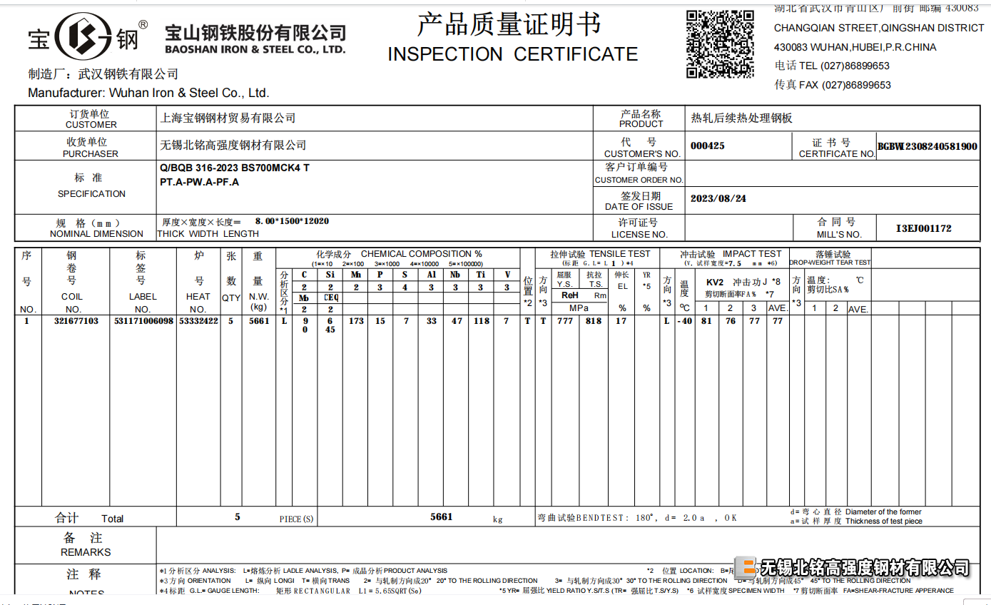 BS700MCK4為寶鋼企標高強度熱處理回火板,指熱軋品種屈服700帕以上 抗拉780帕以上,K4為-40℃耐低溫性能。